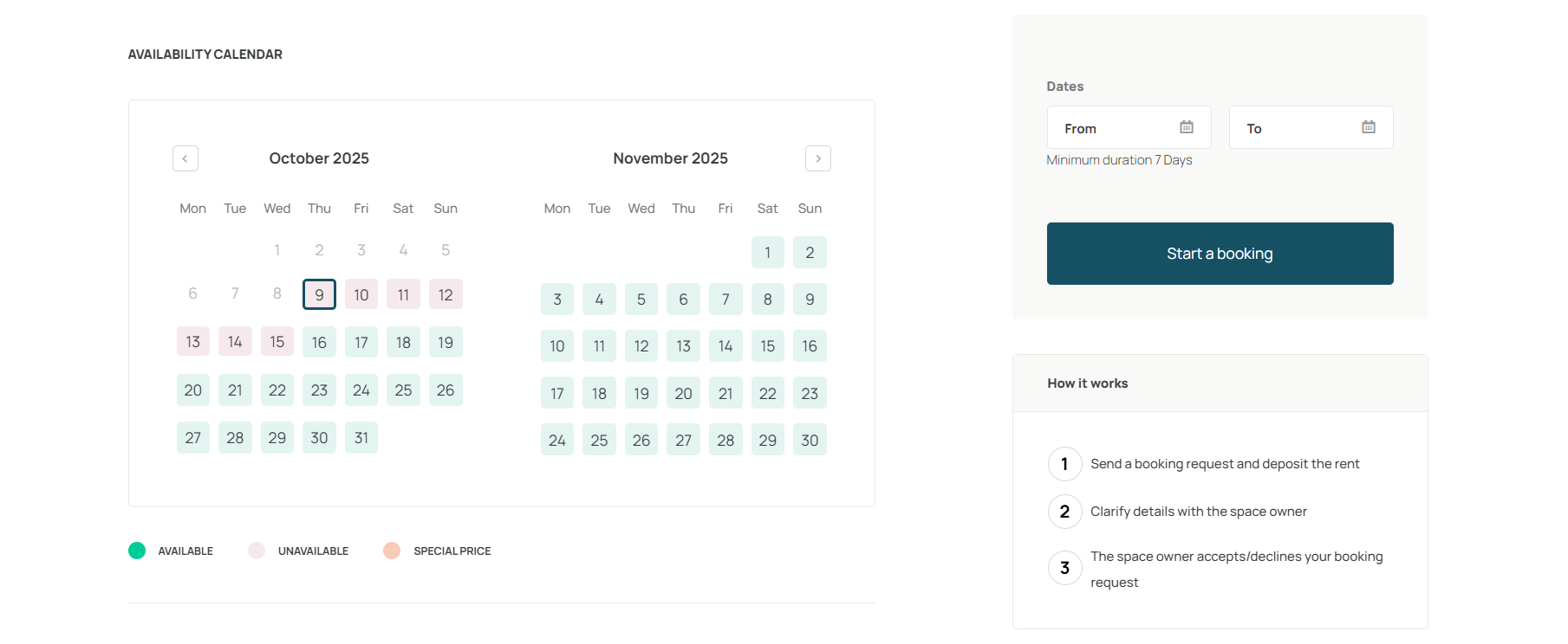 To check the availability of a space, navigate to the Listing page. Below the description, go to the Availability Calendar section, which shows the availability of a space on a monthly basis. The calendar highlights Available days, Unavailable days, and days with Special Pricing, making it easy for you to find the ideal dates for your booking.